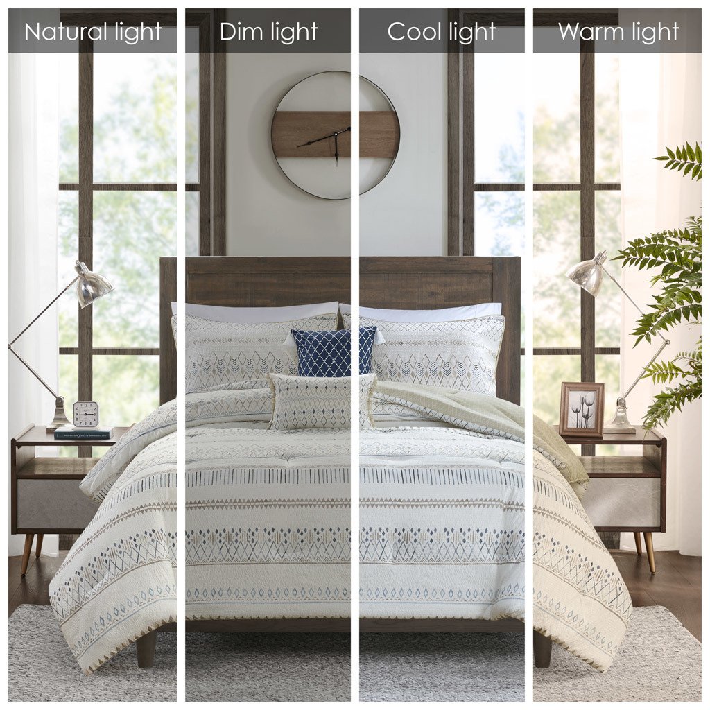 DescriptionSoft and lightweight, the Madison Park Fraser comforter set brings a Southwest inspired touch to your bed. A diamond print in soft blue and taupe colors adorns the light beige face, while a taupe diamond print on the reverse adds a complementary farmhouse look. This set includes a comforter, 2 shams, and 2 decorative pillows with tassels or fringe to tie back into the bedding. This reversible comforter also features an antimicrobial treatment to help reduce the growth of odor causing bacteria and keep the fabric lasting longer. This set is machine washable in a large capacity commercial washer/dryer for best care.Product DetailsKing/Cal King1 Comforter:104"W x 92"L2 King Shams:20"W x 36 "L (2)1 Square Decorative Pillow:16"W x 16"L1 Oblong Decorative Pillow:12"W x 18"LMaterialComforter/Sham: 100% polyester microfiber seersuker print face and print back; antimicrobial treatmentFilling: 100% polyester