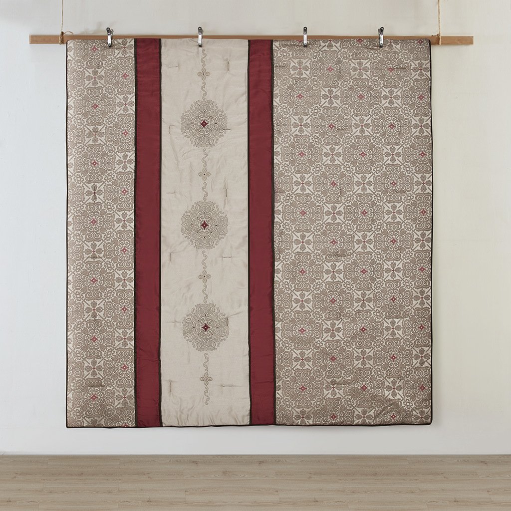 DescriptionDonovan is an elegant update to your bedroom. This red comforter features a modern color blocked look with embroidered taupe details. The bold red stripes draw your eye into this beautiful comforter. Three decorative pillows further accentuate the colors and embroidered details in this collection. Also includes two standard shams which pull the whole look together. The comforter is made from 100% polyester and is machine washable for easy care. Items in the set may come in a rolled or compressed packaging, which will need to be fluffed up or steam ironed before use to remove wrinkles.Product DetailsQueen1 Comforter:90"W x 90"L2 Standard Shams:20"W x 26"L (2)1 Bed Skirt:60"W x 80"L + 15"D1 Decorative Pillow:18"W x 18"L1 Decorative Pillow:12"W x 18"L1 Decorative Pillow:16"W x 16"LMaterialComforter/Sham: 100% polyester jacquard pieced with solid polyoni with embroidery, 100% polyester brushed fabric reverseFilling: 100% polyesterBedskirt: 100% polyoni drop, polyester platformPillow: 100% polyester shell, polyester filling