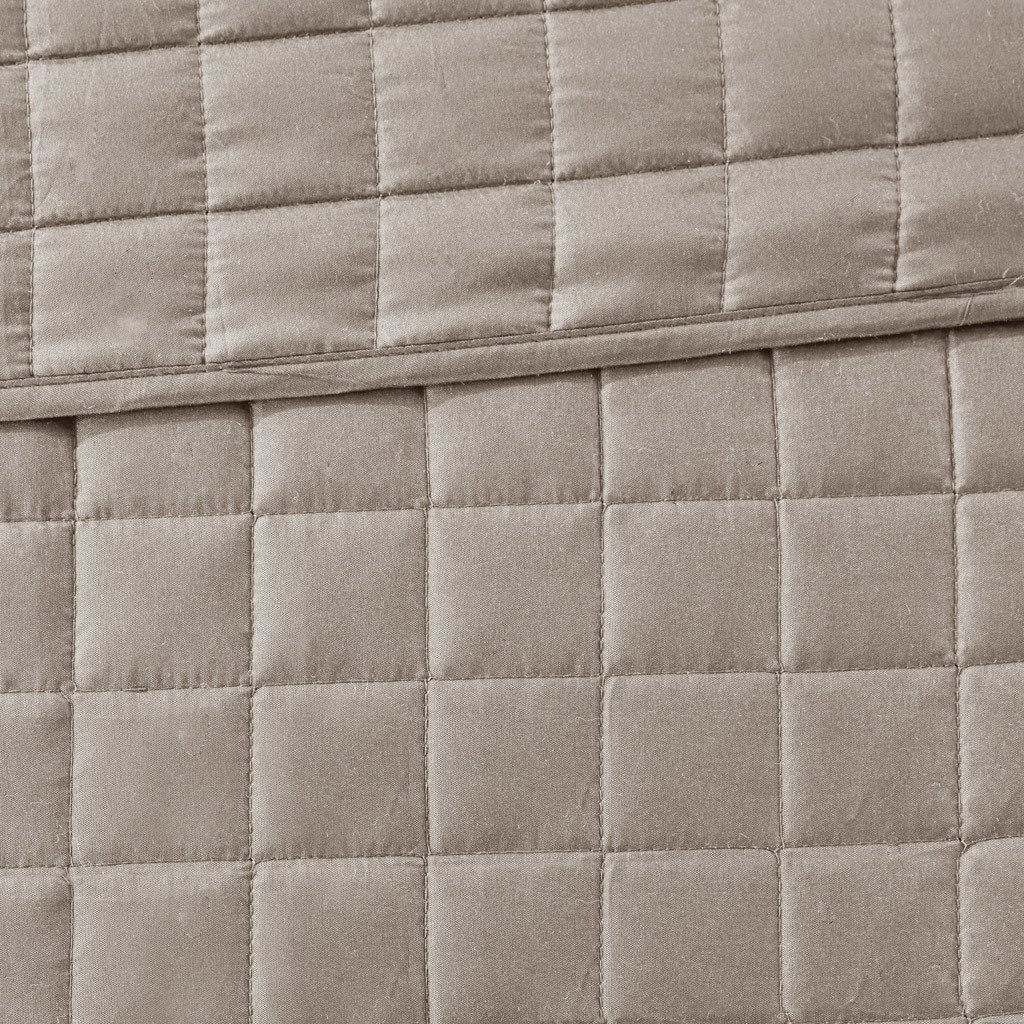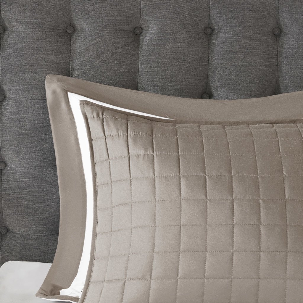 DescriptionThis Heritage hotel bedding collection includes a comforter and quilt that both come with matching shams to complete a luxurious layered look. The soft comforter and shams showcase a bold border on a white ground with a solid white reverse, while the lightweight quilt and its shams display a window pane end-to-end quilting pattern. Two decorative pillows, one square and one oblong with embroidered and pieced details provide the perfect finishing touches to this 8 piece bedding set. This set is available in grey, navy, and taupe options. Machine washable for easy care, this collection is great for year-round use.Product DetailsFull/Queen1 Comforter:90"W x 90"L2 Standard Shams:20"W x 26"L + 2"D (2)1 Quilt:90"W x 90"L2 Standard Shams:20"W x 26"L (2)1 Decorative Pillow:16"W x 16"L1 Decorative Pillow:12"W x 16"LMaterialComforter/Sham: Soft brushed microfiber face and backFilling: 100% polyester fillingQuilt: Soft brushed microfiber face and backPillow: 2" box quilting, microfiber pillows